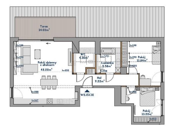 • Apartamenty 2-, 3- i 4-pokojowe o powierzchni od ok. 47 do 89 m² z dużymi balkonami, tarasami lub prywatnymi ogródkami.